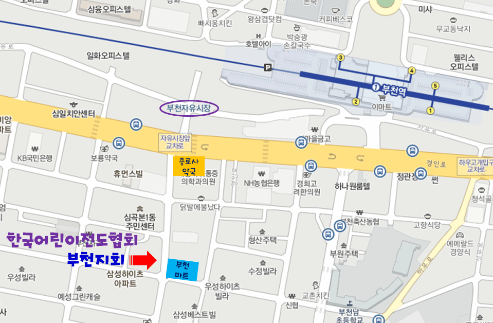 한국어린이전도협회 부천지회 오시는 길 주소: 부천시 소사구 심곡본 1동 660-5 거성빌딩 3층전철: 부천역 남부역으로 나오셔서 인천 방향으로 자유시장까지 오셔서 길건너 종로사 약국 골목으로 들어서 100m 정도 걸으시면 부천마트 맞은편 거성당구장 보이면 그 건물 3층으로 오세요약도: